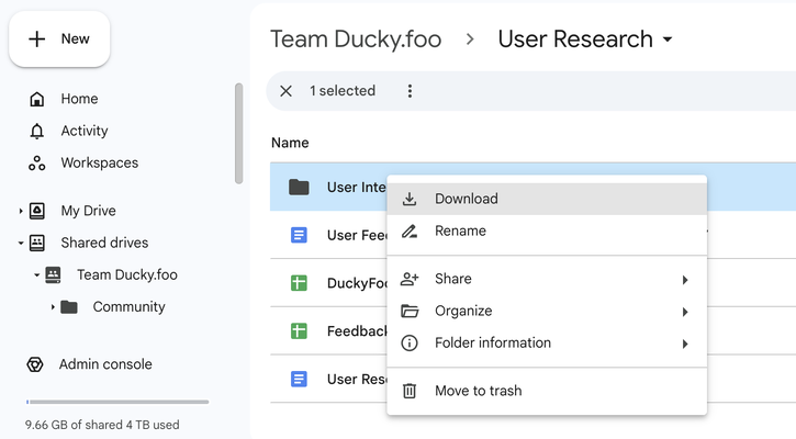 All of my feedback notes and transcripts are stored in Google Drive, so step one was to download them all locally. Easy enough-- just right-click on the folder with all of these notes and choose Download.