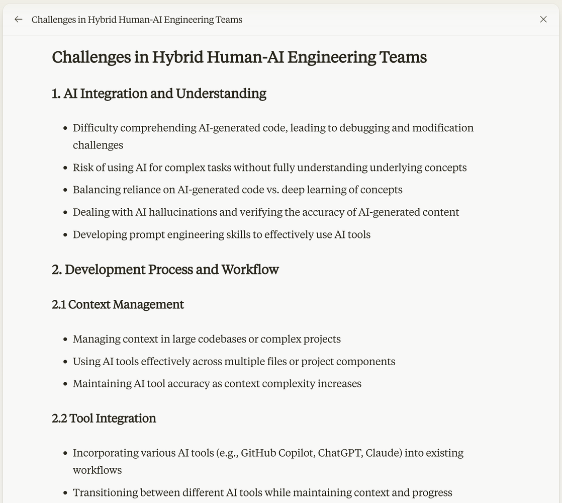 For this startup, SpecStory, I've had 60+ conversations with engineers, product managers, and product development leaders on topics ranging from rubber duck debugging to the challenges of mentoring junior team members in the age of GenAI. There's gold in these interviews, and I've been going back over them scanning for insights. But with Claude Artifacts, there's a new way to quickly synthesize this feedback. Let's walk through the analysis step-by-step.