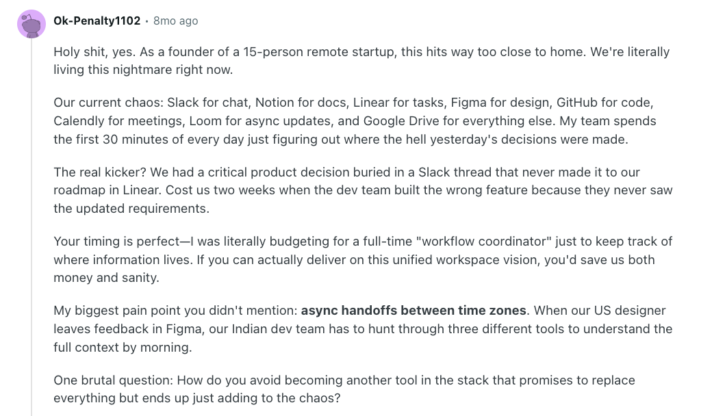 One founder laid it out bluntly. Their work was spread across Slack, Notion, Linear, Figma, GitHub, and more. Everything existed somewhere, but nothing was easy to track. So even though, all information were available but scattered, so people still felt lost.