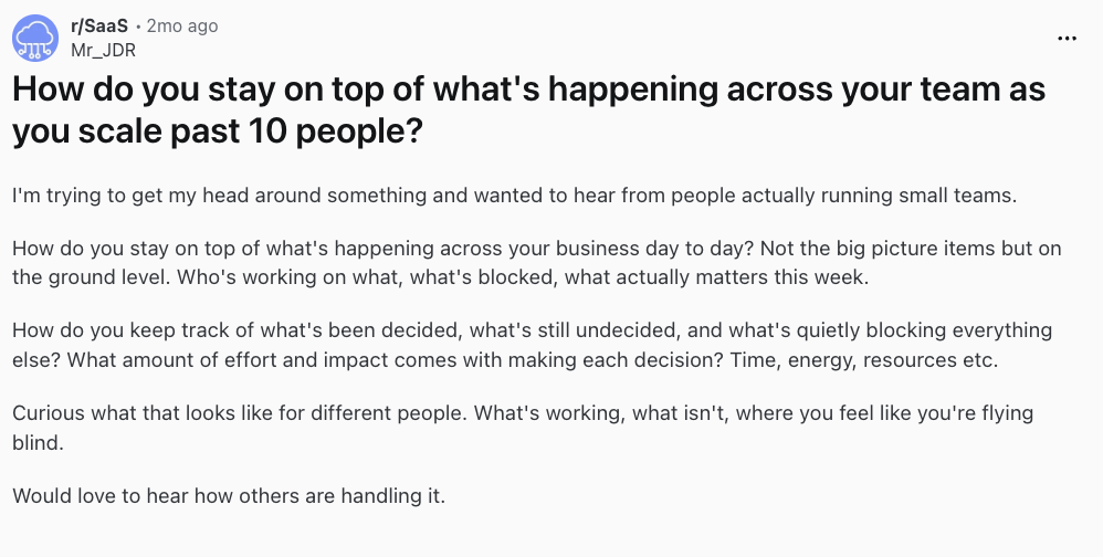 A SaaS founder described how things start to break around ten people. At some point, with enough information moving around, you stop knowing who knows what. And once that happens, alignment becomes slower and more fragile.