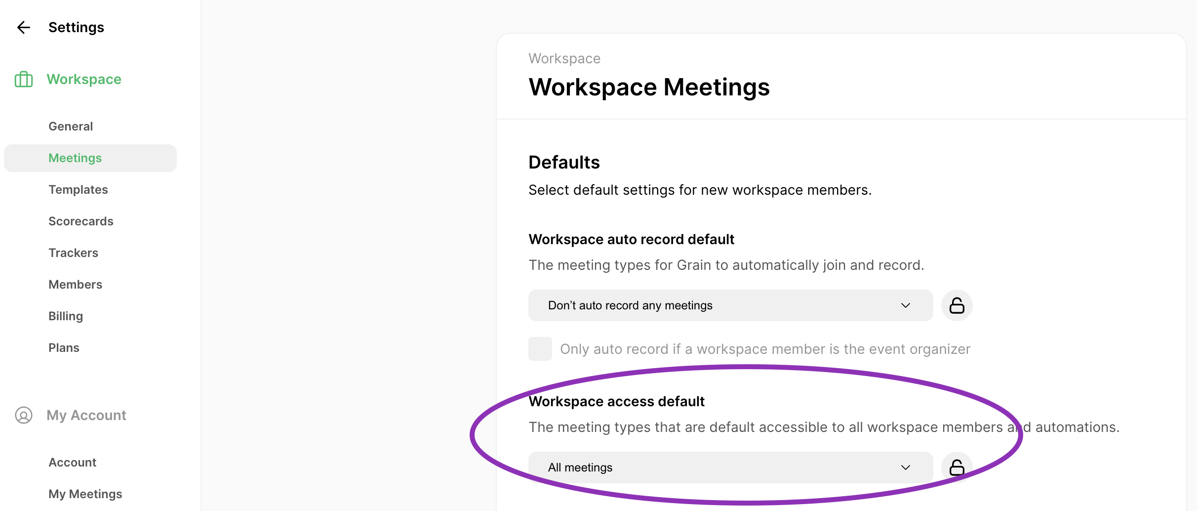 It's also helpful to turn on Grain Workspace access by default for all meetings so you don't have to manually set it for each video: